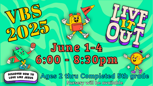 We can't wait to LIVE IT OUT for Jesus! This year we'll guide the children in embracing a life of love just as Jesus did. We will be exploring a series from the New Testament and engaging in memorable activities and catchy songs! If you have any questions, see JD Deadmond.